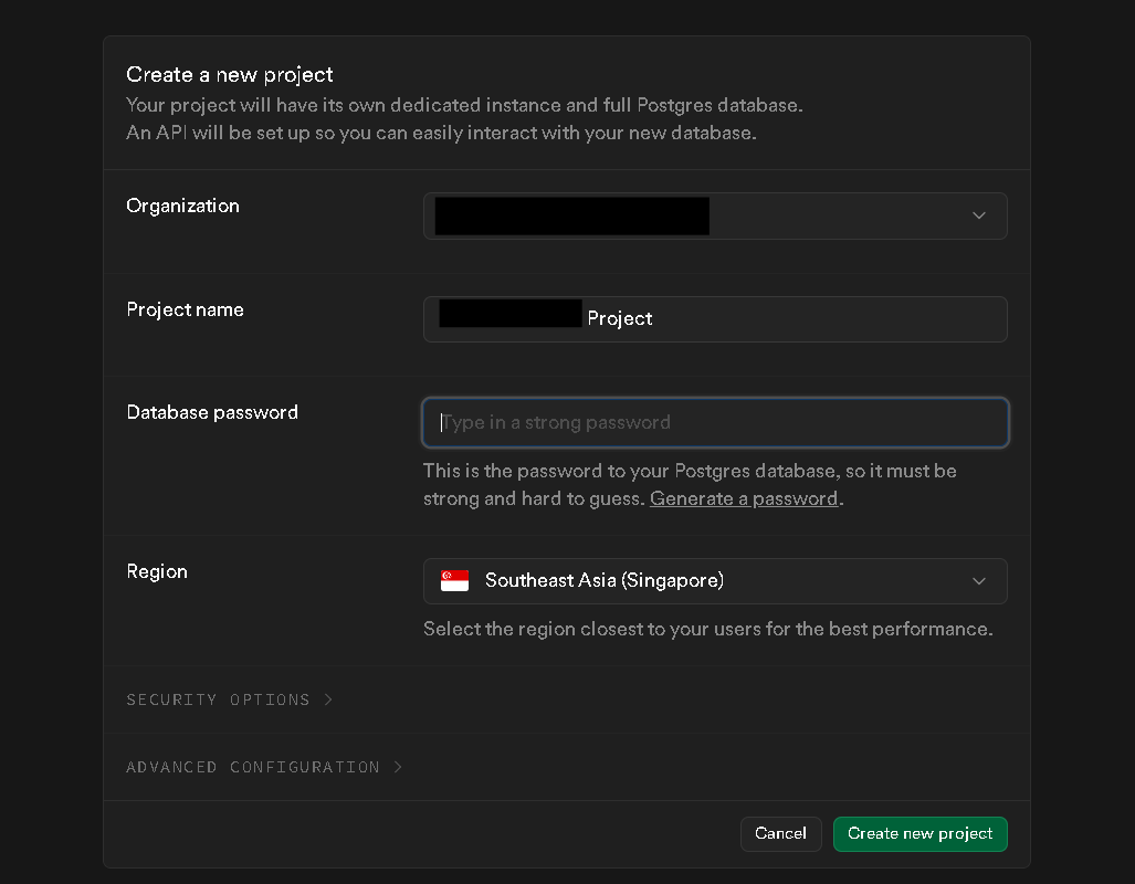 Visit Supabase | The Postgres Development Platform. Register or sign up for a new account, and choose a strong database password as shown in Figure 1.